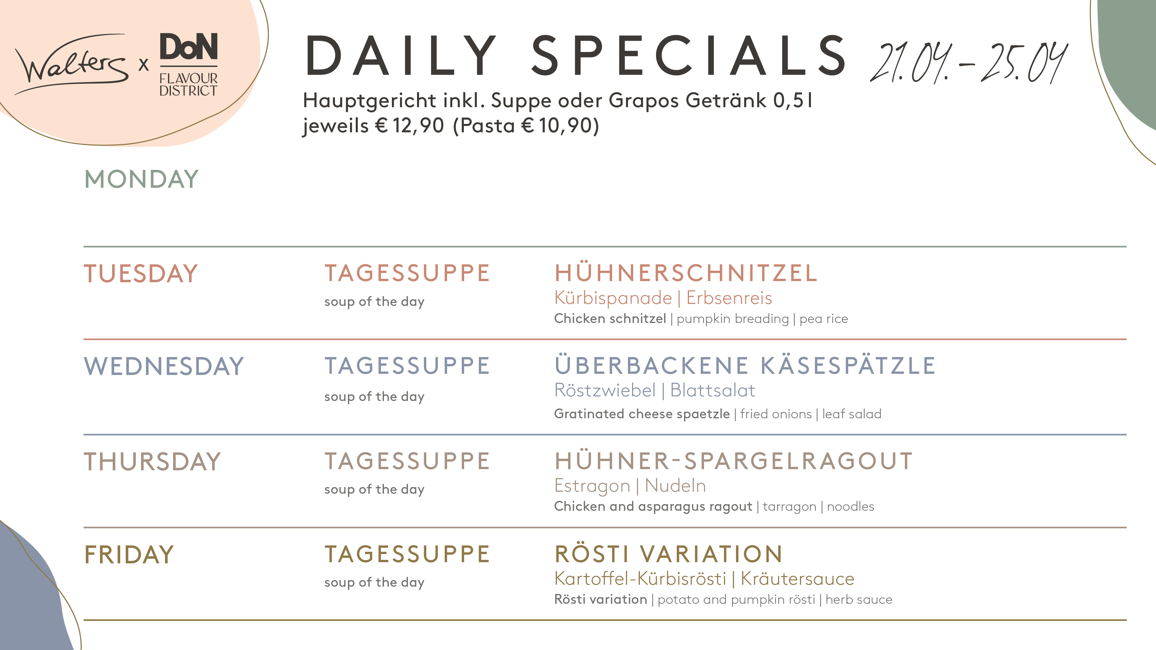 In Walters Restaurant, Walters Salon oder Walters Deli, ob vor Ort, zum Abholen oder liefern lassen - Die kulinarische Vielfalt reicht von österreichischer Küche über italienische Klassiker wie Pizza und Pasta, bis hin zu veganen Gerichten. Lass dich verwöhnen und gönne dir eine kulinarische Auszeit mit abwechslungsreichen Speisen in gemütlicher Atmosphäre.